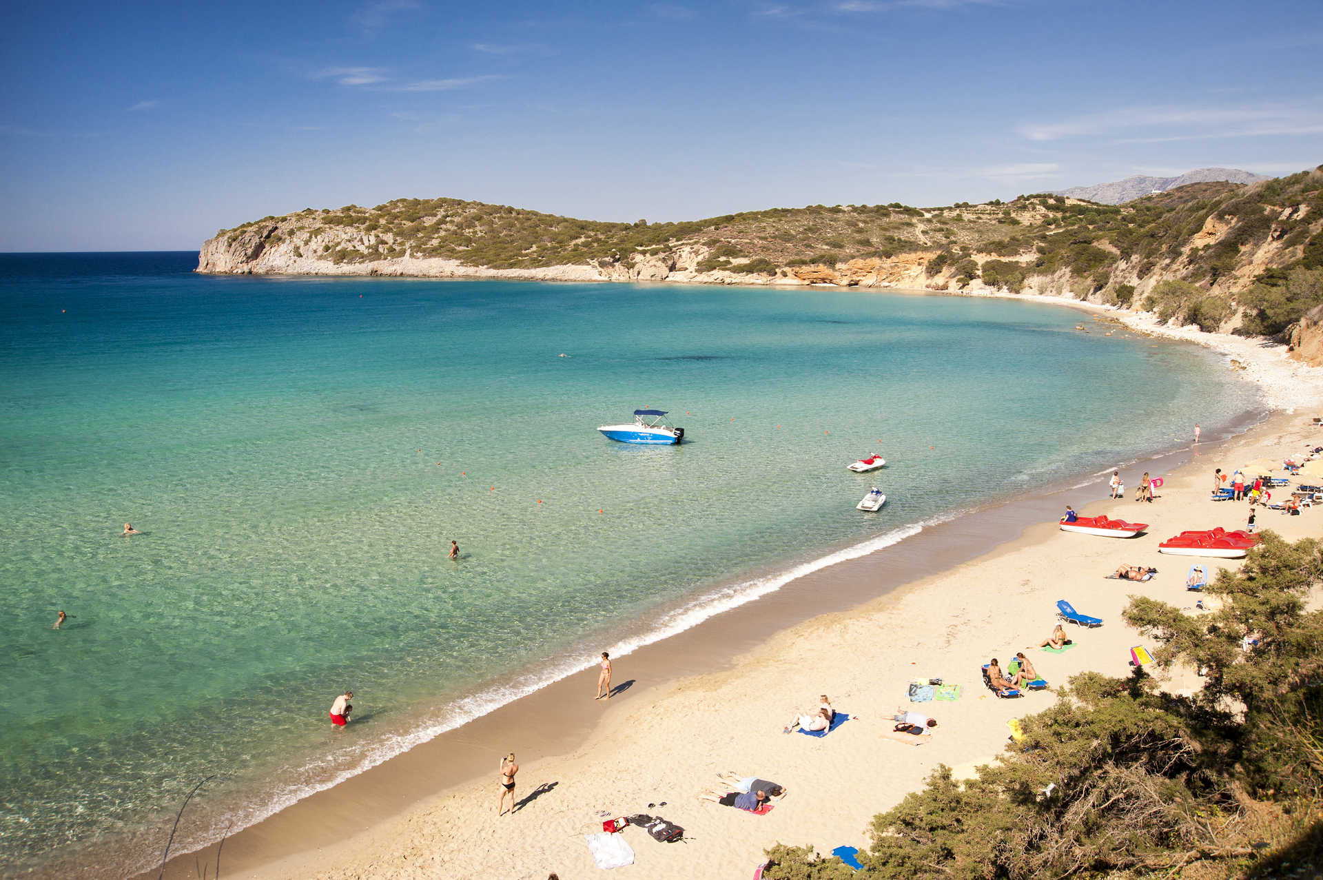 Stroll through the olive groves to Agios Panteleimonas with the church on the headland. The sand and shingle beach here has sunbeds and umbrellas available to hire, or just along the main road is the beach of Voulisma. Alternatively, Golden Beach with its fine white sand, sun beds and umbrellas and small cafe is definitely worth a visit. You can snorkel at the beach of Karovostasi which is a mix of sand and pebble, or you can also learn to dive at the centre on the beach at Istron Bay Hotel.