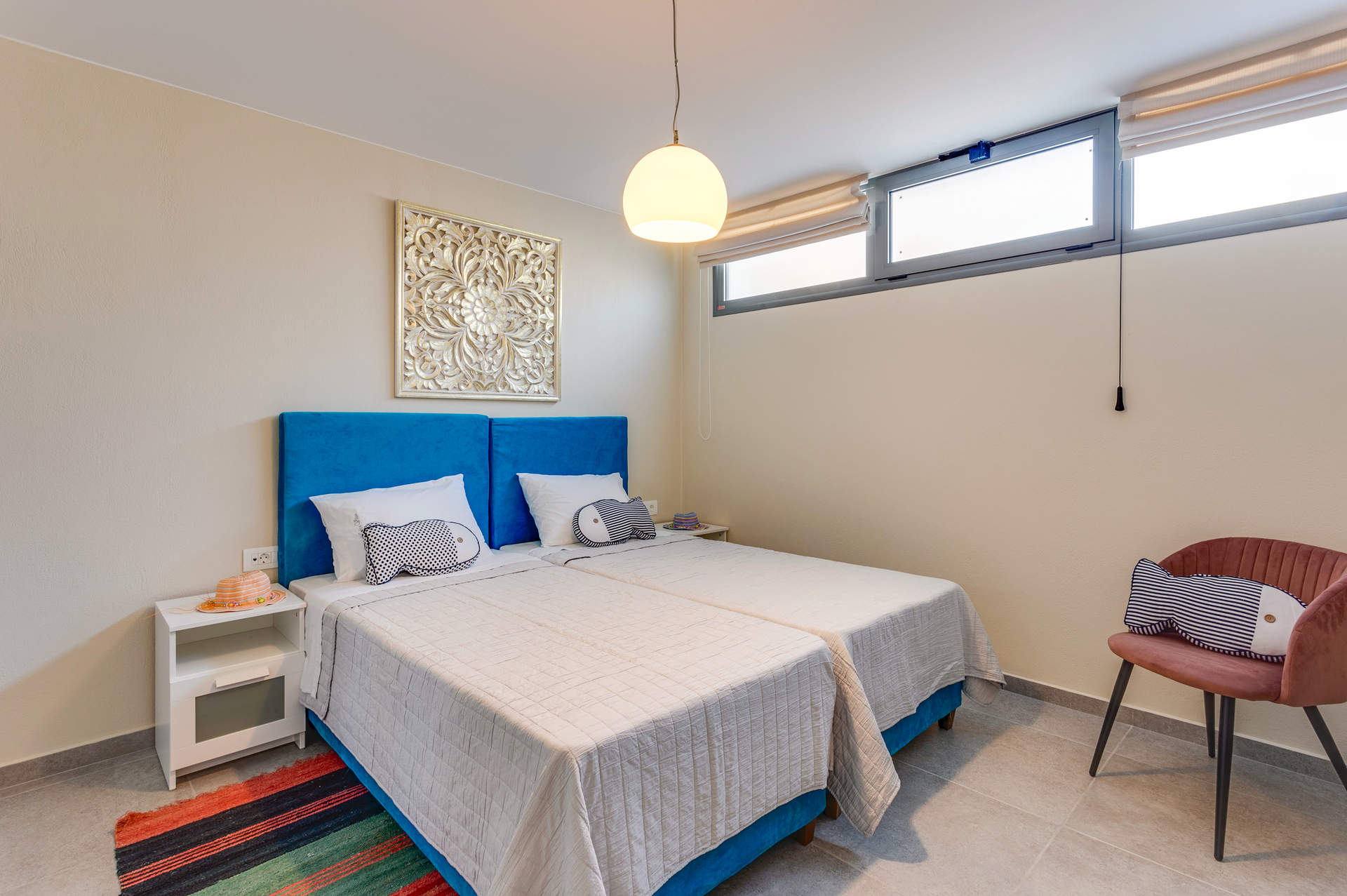 The open plan lounge, dining and kitchen are sophisticatedly designed with comfortable sofas, a flat screen TV, and a sleek dining table with chairs. Adjacent is the glossy and fully equipped kitchen with modern appliances, ideal for perfecting your culinary skills. A set of patio doors open onto the pool terrace ensuring the room is filled with natural light and a cool breeze. The contemporary features throughout this stylish villa combined with the sociable design create the perfect space for your party to relax. From here, a staircase takes you down to the lower ground floor.