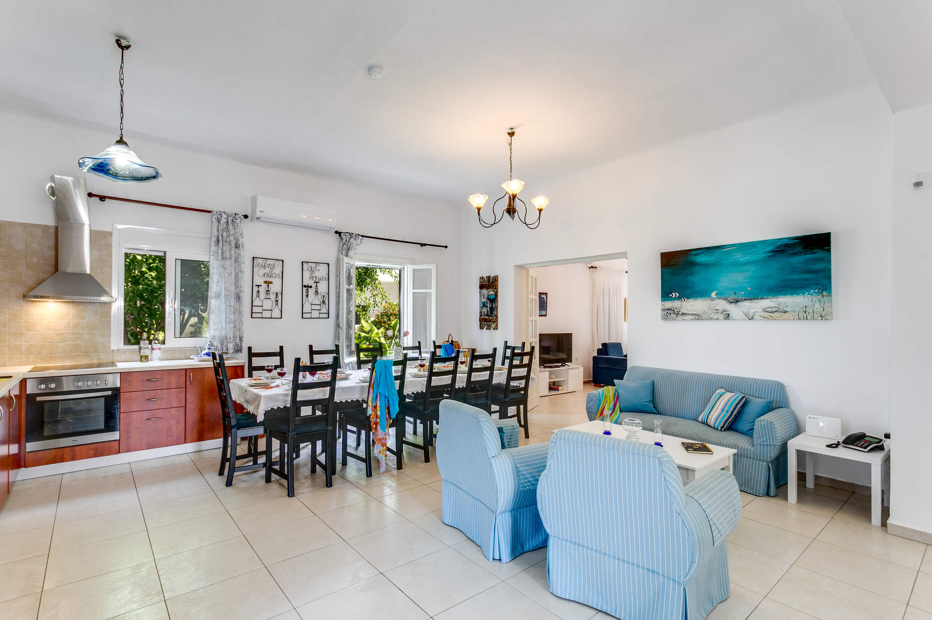 The private pool takes pride of place amongst the spacious terrace. This is a great place to spend lazy days whilst taking in the views of the olive and citrus groves, against the mountain backdrop. There is a pergola in the far corner and a brick BBQ for a spot of alfresco dining. Steps from the pool lead to a raised, shaded terrace with views of the surrounding countryside and village churches. Here there is traditional Cretan seating where you can relax with a cool refreshment.